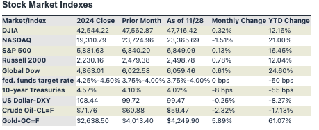 November proved to be a volatile month for the stock market, ultimately concluding with slight gains for several of the major market indexes. Through the middle of the month, investors grappled with concerns about the valuation of megacap tech stocks, leading most benchmark indexes to decline for three straight weeks. However, the market staged a strong rebound late in the month leading into the Thanksgiving holiday, as more economic information became available following the reopening of the federal government. The late-month rally was largely driven by renewed hopes for a Federal Reserve interest rate cut in December. Each of the benchmark indexes ultimately ended November on an uptick, except the NASDAQ, which ended the month in the red, despite a strong rally during the last week of the month.